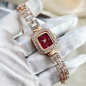 Red Square Faced Rhinestone & Gold Bolo Watch