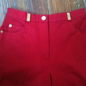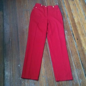 Red high waisted St. John Sport Essentials by Marie Gray pants. 96% cotton and 4% spandex so that you get that flattering stretch. Size 2. Gold detailing on from button, zipper, and belt loops. Slim cut through leg.
