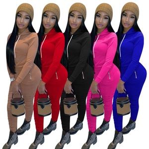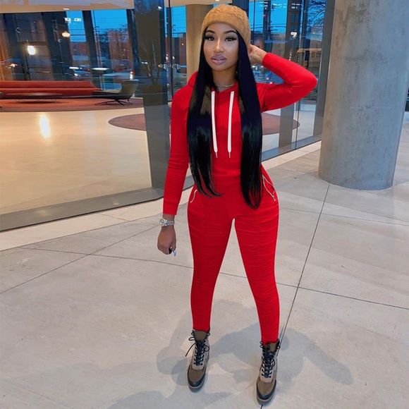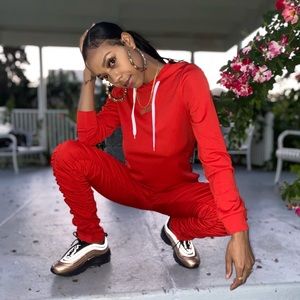 Super cute and comfy 2 piece pullover set with stacked pants bottoms. Polyester material. Red color.
