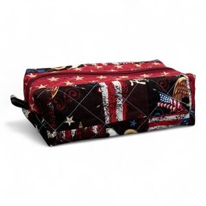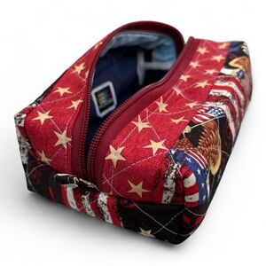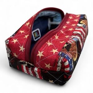 WILLIAMSBURG PORT FONDNESS HANDMADE QUILTED PATCHWORK BOX POUCH | Stylish handmade quilted patchwork box pouch featuring patriotic USA colors — perfect as a pencil case, makeup bag, cosmetic pouch, toiletry bag, or travel organizer. Unique artisan gift inspired by Virginia’s colony and independence charm.