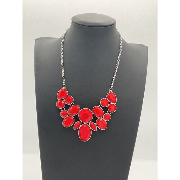 Red Statement Necklace With Oval Resin Stones & Silver Chain Lobster Clasp