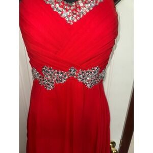 Keywords: red gown, strapless dress, embellished dress, corset back dress, prom dress, formal gown, evening gown, party dress, sweetheart neckline, floor length dress, special occasion dress, red formal dress, embellished gown, red prom dress