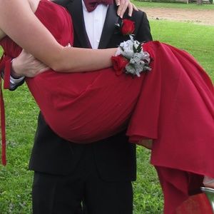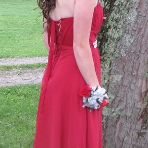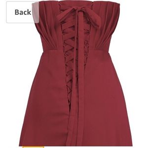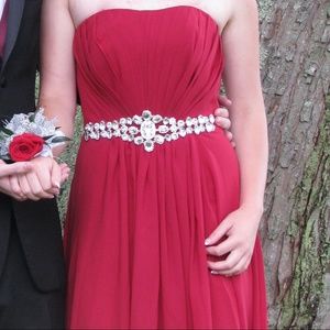 Strapless with padded bra, rhinestone belt, ruffles, empire line, floor-length, chiffon. If you don't want your back being exposed through the ribbon corset, there's a part that can cover it. Pairs nicely with a black cardigan.