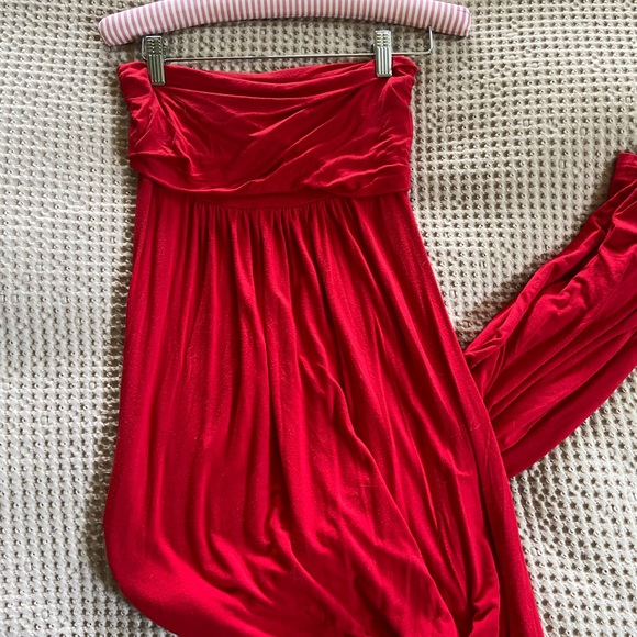 Fold over maxi dress. Bright red in color and long length. Super pretty and soft material. I’ve worn it casual and added a pretty brooch to pin the center to dress it up.