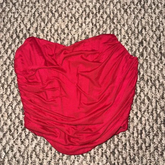 Stylish red strapless top with ruched detailing. Perfect for a chic look.