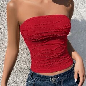 Elevate your style with this stunning red strapless ruched top. Perfect for any occasion, this top offers a chic and flattering fit.