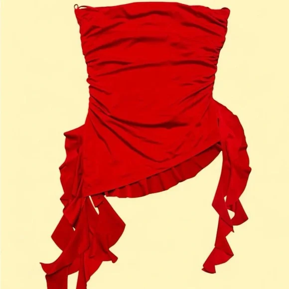 Vibrant red strapless top with ruffle details. Perfect for a bold look.