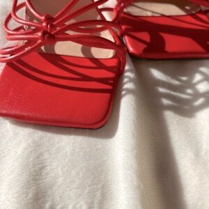 Make a bold statement with these fiery red lace-up heels! Designed with a modern square toe, thin strappy details, and a wraparound ankle to knee tie, they’re perfect for dressing up any outfit—from date nights to summer.