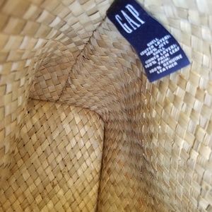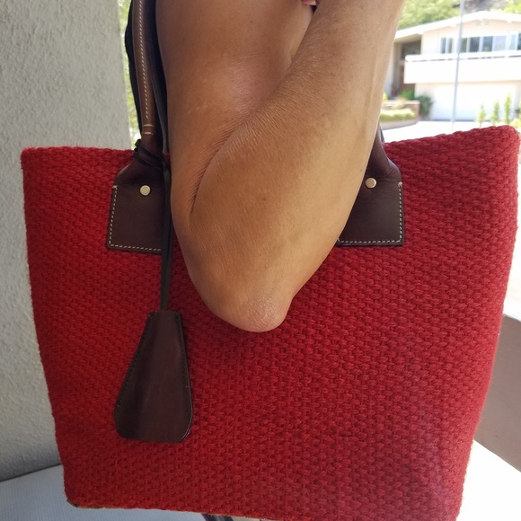 Red bag with fabric exterior cover, brown leather straps and straw interior made by Gap. Great for the beach, gym or to carry books.
