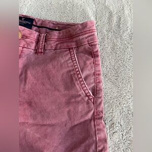 Red Stretch Midi American Eagle Outfitters Women’s Shorts. Women’s Size 0. 97% cotton 3% elastane. Made in Bangladesh. Faded red dye color with denim cotton feel. Midi rise. Stretch material. Deep front angled pockets. Back pockets with back darts above them. Zipper with brown button closure. “American Eagle Outfitters” imprinted on button. Belt loops around waistband. AEO logo embroidered above back right pocket. ($15, #118)