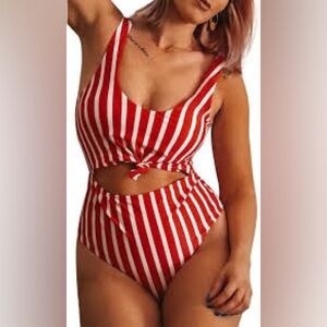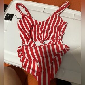 Red Stripe Print Halter Tummy Control Lace up OnePiece Swimsuit NWT Size 4 or XS
