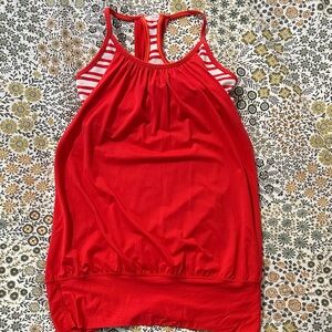 Lululemon GUC, size 8, vibrant red tank top with white stripes. Features a racerback design, built in peekaboo shelf bra with modesty pads, and a banded bottom. I cut the tags off, size 8.