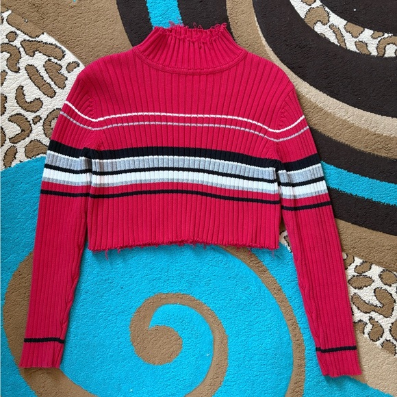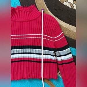 Stylish red ribbed sweater with black, white, and pink stripes. Cropped design with long sleeves. No size or brand tag plz check measurements in pics