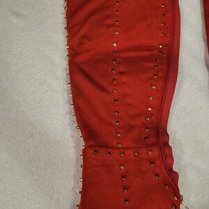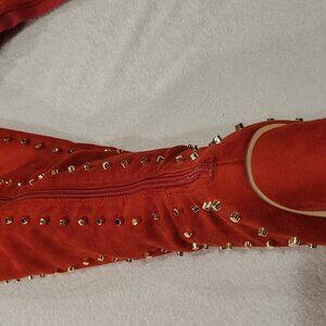 Make a bold entrance with these brand new red high-heeled boots, decked out in gold studs and unapologetic flair. Perfect for fashionistas, performers, or anyone who wants their footwear to speak louder than words.