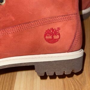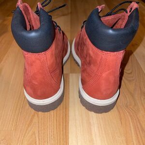 These are custom made/custom ordered red suede and black leather timberland boots! Ankle length, white bottoms, black laces. Still in the original box. Box has wear from being in the closet and being moved around. Boots are in perfect condition!