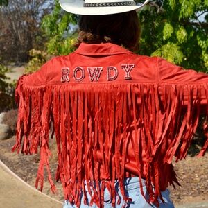 The perfect terracotta/red fringe jacket to spice up any outfit! Customize it for your bachelorette, birthday, football season, or or get them plain for a country concert/Stagecoach outfit! Gift to yourself or your bride tribe for her Nashville Bach/She found her perfect match/Vegas Bach/21st Birthday! Get these jackets plain or custom! A little cute, a little country! Lots of uses for this amazing jackets!