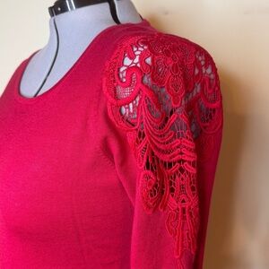 Sexy red sweater featuring fun lace shoulders. Perfect for adding a touch of sophistication to your wardrobe, valentines dinner and more.