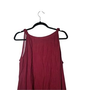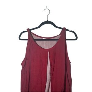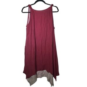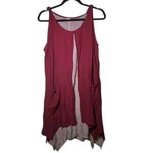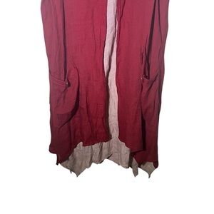 Red and pinkish tan, layered, sleeveless tunic top. 50% cotton / 50% silk. Has pockets. Has open front detail that gives is a breezy, flowy look. Preowned but in good condition.