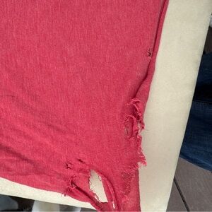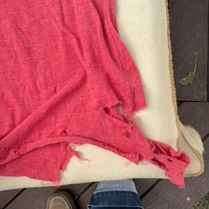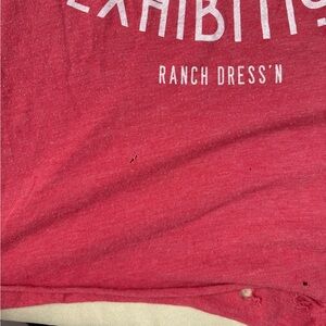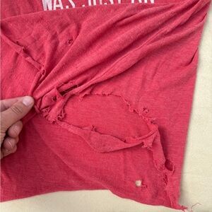 Red tank “My Ex was just an exhibition” from Fallon Taylor. Size M little of a looser fit. Bottom left corner was chewed by my puppy, does not affect the wear. Couple other holes from wear shown in pictures. Smoke free, pet friendly home. May have pet hair on it but will try to get most off. Always hung dried.