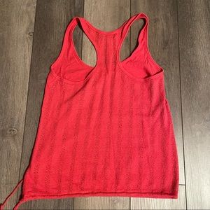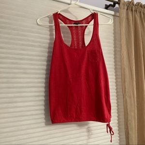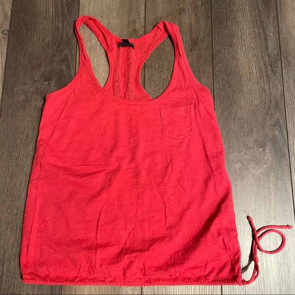 Lacey design on the back of the top. It also has a string around the waist area to make the top more form fitting. In great condition. Only worn a handful of times. No stains and no holes.