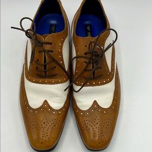 These classic Oxford shoes feature a sophisticated two-tone design in brown and white leather, complete with intricate brogue detailing. The traditional lacing and leather sole enhance their timeless appeal, making them a perfect choice for formal occasions.