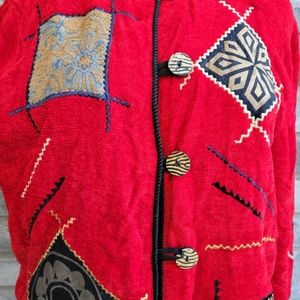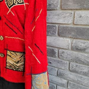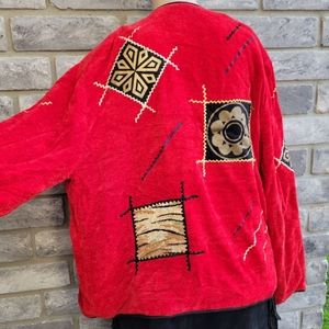 beautiful vibrant and soft tapestry patchwork jacket. unique patterns with braided piping. lined on the inside.
