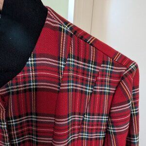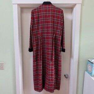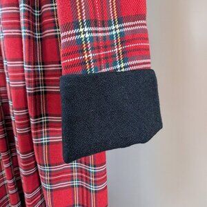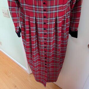 Red tartan dress, very cool! Vintage, looks barely worn (to just one holiday party, maybe?). Polyester / rayon that feels denser, like a light wool blend. Ties in back for adjustable fit. Black velvet covered buttons down the front, a snap at the base of the velveteen collar. Black velveteen cuffs. Bracelet-length sleeves. Midi length. Unlined. Brand: Orvis, Jessica Howard. Size 12. Great condition.