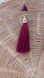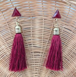 Stylish red tassel earrings with gold accents. Features a triangular design.