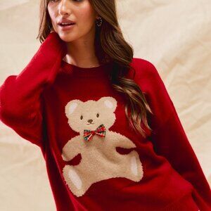 - Red Teddy Bear Christmas Sweater w Checkered Bow, Cozy, S-XL