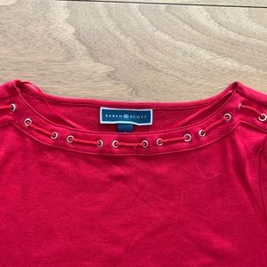 Very simple red tee but looks great with a cardigan. No accessories needed due to the design around the collar. TTS.