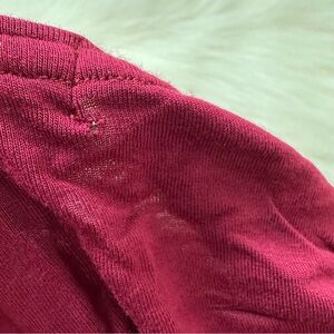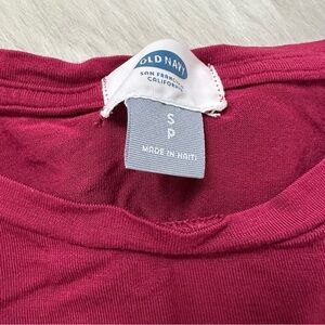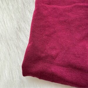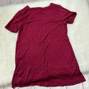 Size S. True to size. Super stretchy. Runs long. Side slits. Crew neck. Burgundy red color. Super soft and comfortable. Has small hole at top back of neck as shown.
