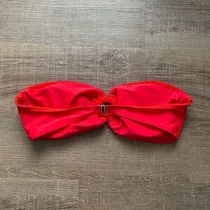 Stylish red bikini top. Features a textured design. Perfect for beach days.