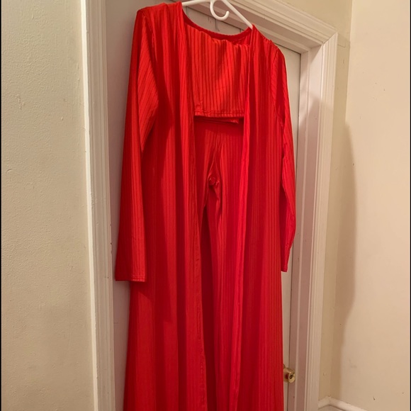 Scoop neck, long sleeve, open front, crop top, full length, wide leg, high waist, wrinkle design, all over solid and loose fit. Medium softness, stretchy, and comfortable to wear.