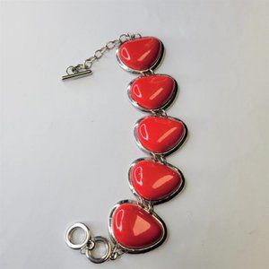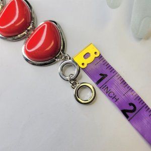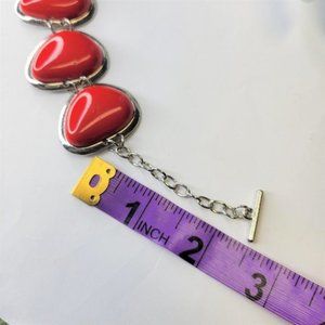 Five large bold red coral like jewels carefully shrined in silver tone cases and all delicately linked together with a adjustable toggle clasp