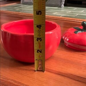 Charming red ceramic container shaped like a tomato. Features a green stem lid.