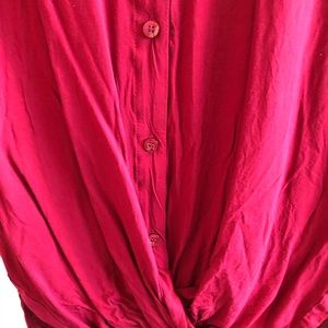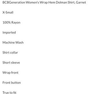 BCBGeneration wrap hem dolman sleeve shirt is 100% rayon, with cuffed sleeves, partial front button placket, collar, rolled front hem, long shirt tail hem and eyelet detail on the back. Garnet red - a color you can’t find elsewhere in stores or online! Only worn once, like new condition. A fashionable choice for work or business dinners, beautiful garnet color.