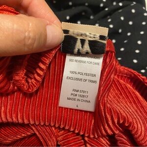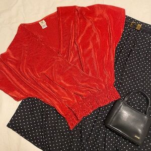 Elegant red women's top with a stylish design. Cinched/elastic waist. V-neck. Lightweight.