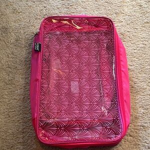 Set of three red travel packing cubes with clear tops. Perfect for organizing your luggage.