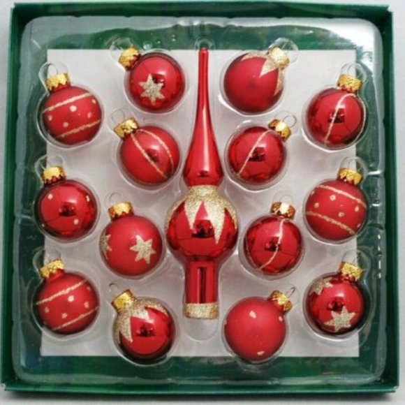 Red Mini Finial Tree Topper & Glass Ball Ornament Set of 15 Kurt Adler Mini red glass ball ornaments with gold glitter accents 1.25" 5.25" tall mini finial red tree topper High quality handcrafted glass ornaments Perfect size for a table top tree Mini ornament and tree topper set is from the Kurt Adler company, known for their outstanding quality and design ornaments and decor