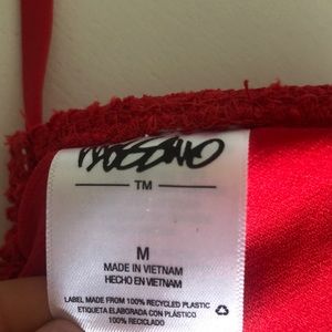 Bright red bikini with lace/netted look, removable pads, tie string. The triangles are able to be worn close together or separate. Only worn a couple times — it’s just too big for me so I have to let go :(