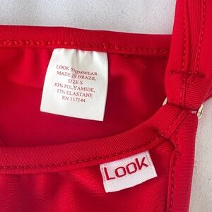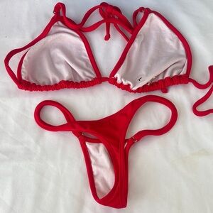 Bright red two-piece bikini set. Triangle top with adjustable ties. Matching minimal-coverage bottoms with double side straps. Smooth, solid fabric. Swim-ready and bold.