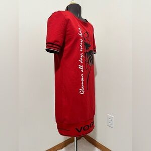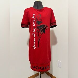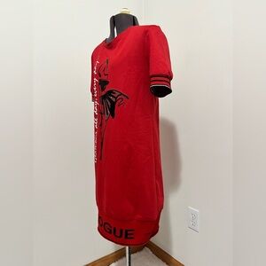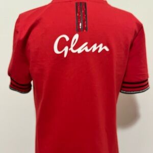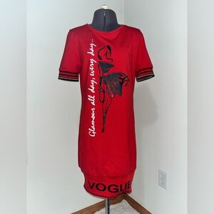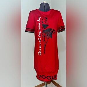 This stylish and chic red knit dress by Tricotto features black accents, a bold graphic fashionista design and rhinestone accents. Front reads “Glamour all day, every day…”. Back has rhinestone detail and “Glam” print across top. Short sleeves display stripe detailing with silver metallic accent. Unlined.
