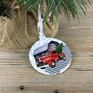 Red Truck in front of a rustic barn with a snowflake and buffalo plaid background on this Christmas Ornament. Aluminum 2 Sided Christmas Ornament with Ribbon, 3" x 3.37" x .030" thick. Feel free to ask any questions or request more pictures. Need it personalized? Send me a message and we can see what we can come up with for you.