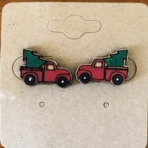 Festive hand painted red truck with tree earrings made of lightweight wood with hypoallergenic posts. Cute, comfy, and great for sensitive ears. Unique handmade holiday accessory or stocking stuffer!