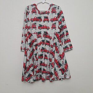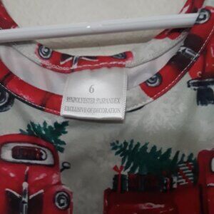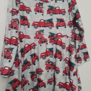 Charming dress with a red truck print. Perfect for festive occasions.