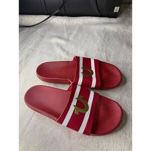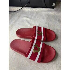 Red True Religion Men's Buddha Logo Slide Sandals size 9 in good preowned condition. Have any questions feel free to ask.