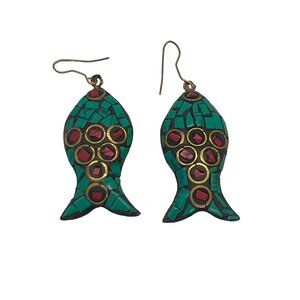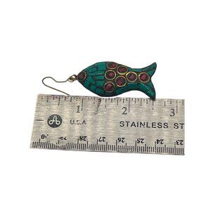 Red Turquoise Resin Bead Brass Necklace Fish Dangle Earrings Tribal Ethnic 20"