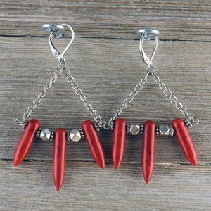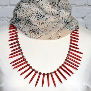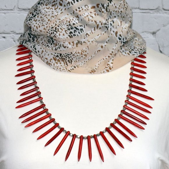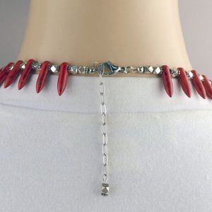 This necklace has red turquoise spike beads graduating in size from 20mm to 50mm in length. There is a 4mm western style silver bead in between each stick. It has a stainlesssteel closure that includes a lobster claw clasp, extension chain and jump rings