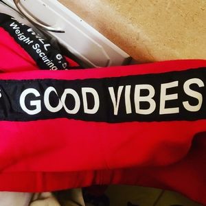 Good vibes only when you have on these twill joggers. Red with taping down the leg that says "GOOD VIBES". Belt included.