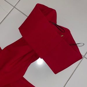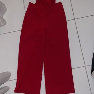 Sharp, red, two piece, strapless top with a large bow and ankle pants.